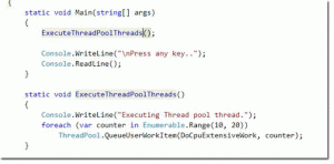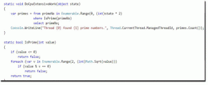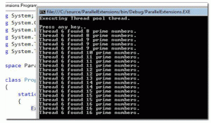 The above code does, takes an input integer and doubles that, and finally finds the prime numbers from zero to that extent. Well, this is nothing quite useful, but enough to demonstrate an application. This method also writes the executed thread ID into the console window.