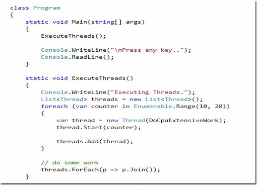 The above code does, takes an input integer and doubles that, and finally finds the prime numbers from zero to that extent. Well, this is nothing quite useful, but enough to demonstrate an application. This method also writes the executed thread ID into the console window.