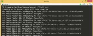 The process takes about 25 to 30 minutes based on internet speed, but it ends up having a production ready mesos cluster up and running on Windows Azure. All we need to do is get the powershell script and vagrant file and launch the “Light.ps1” form powershell command line. Which is kind of cool!