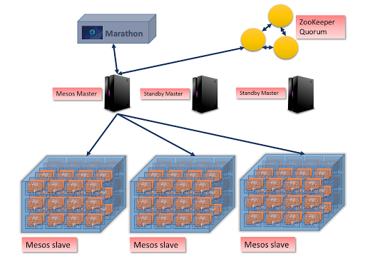 Mesos is built using the same principles as the Linux kernel, only at a different level of abstraction. The Mesos kernel runs on every machine and provides applications (e.g., Hadoop, Spark, Kafka, Elastic Search) with API’s for resource management and scheduling across entire datacenter and cloud environments. It can scale out to massive clusters like 10,000 of nodes. Its Fault-tolerant replicated master and slaves using ZooKeeper, and supports docker containers.