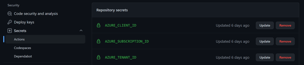 GitHub action need to talk to Azure and it requires authentication. I will be using Workload federated identity -which is a very neat way to deploy code from GitHub without any secrets spread outside of Azure.