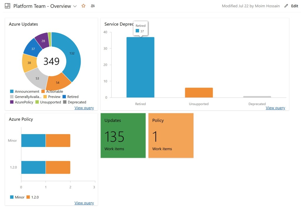 With work items now accessible in Azure DevOps, we can create a unified dashboard to visualize Azure Updates and Policy updates in a single view.