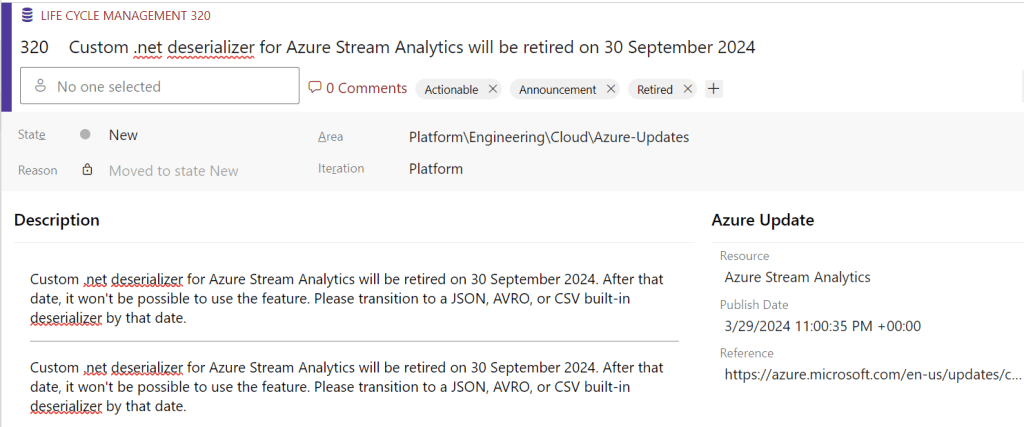 It is a Daemon/Worker service running as a Container Job that periodically reads the RSS of Azure Updates. Once the updates are read, it will analyze each of the updates through Azure Open AI to generate those actionable insights. Once the insights are generated, it will create a Backlog item into Azure DevOps, so the team can prioritize that in their workflow. These backlog items are intelligently marked or tagged with actionable labels such as “Actionable,” “Retired,” “Deprecated,” or “General Availability.” This tagging system enables teams to quickly prioritize and address the most pressing updates based on their relevance and impact on the organization’s scenarios.