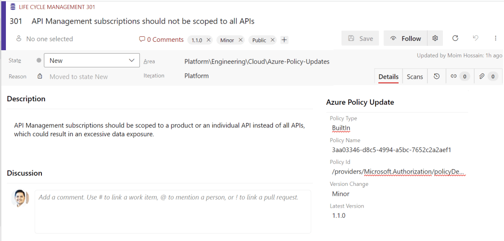 Upon identifying Azure policy updates, the AI system creates detailed Product Backlog Items (PBI) that clearly outline the changes and potential impact on the organization’s Azure environment. These PBIs serve as actionable insights, enabling teams to assess the significance of policy changes and implement necessary adjustments or mitigations as needed.