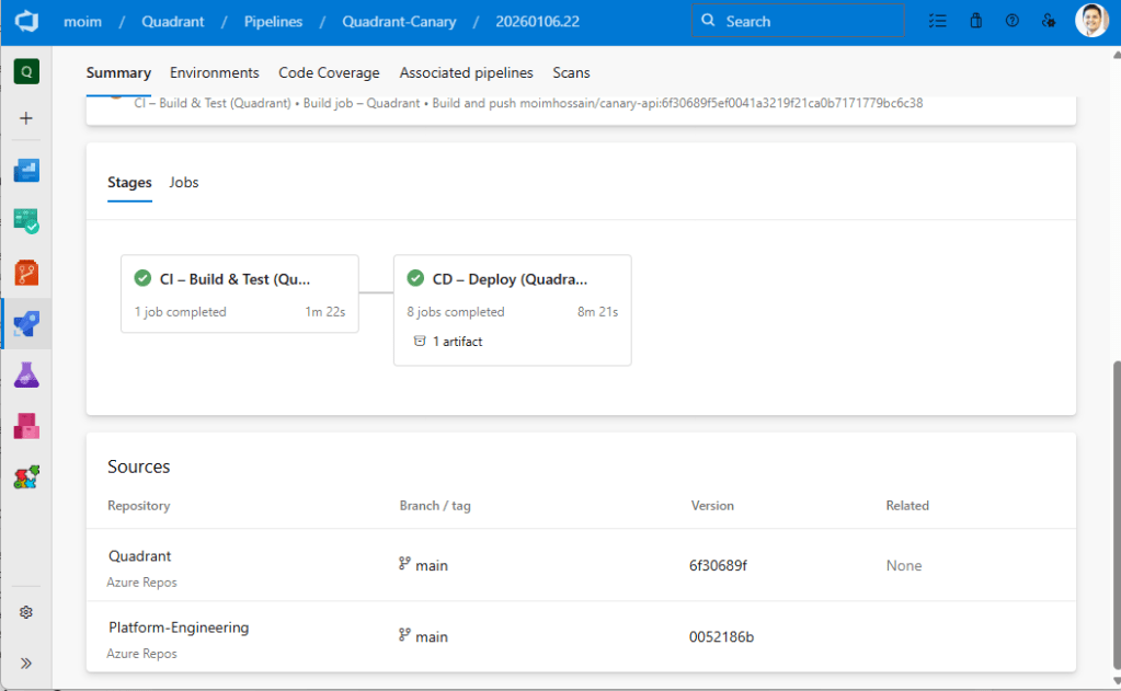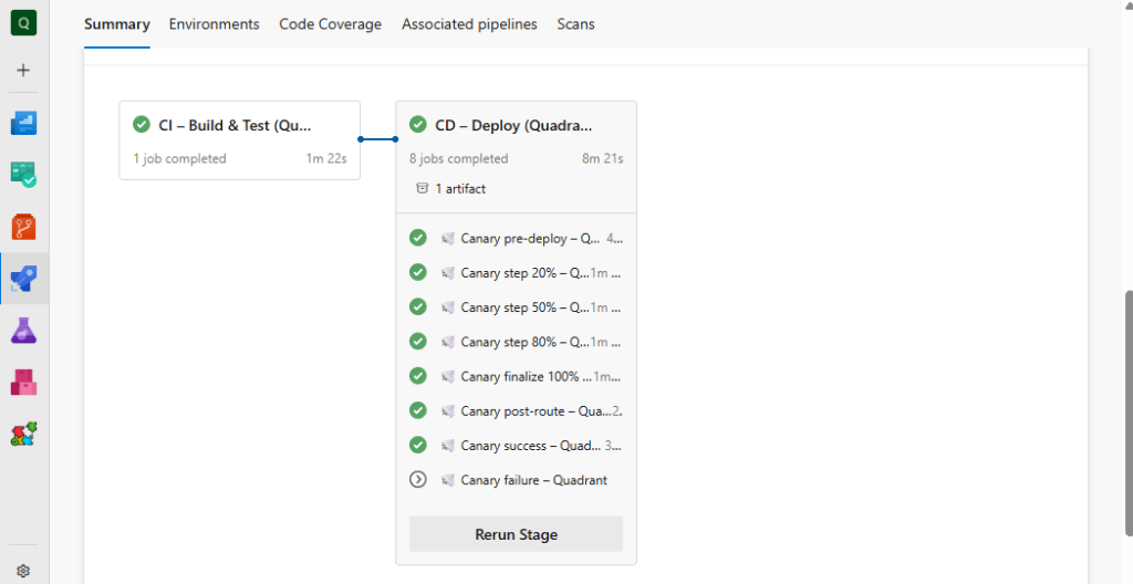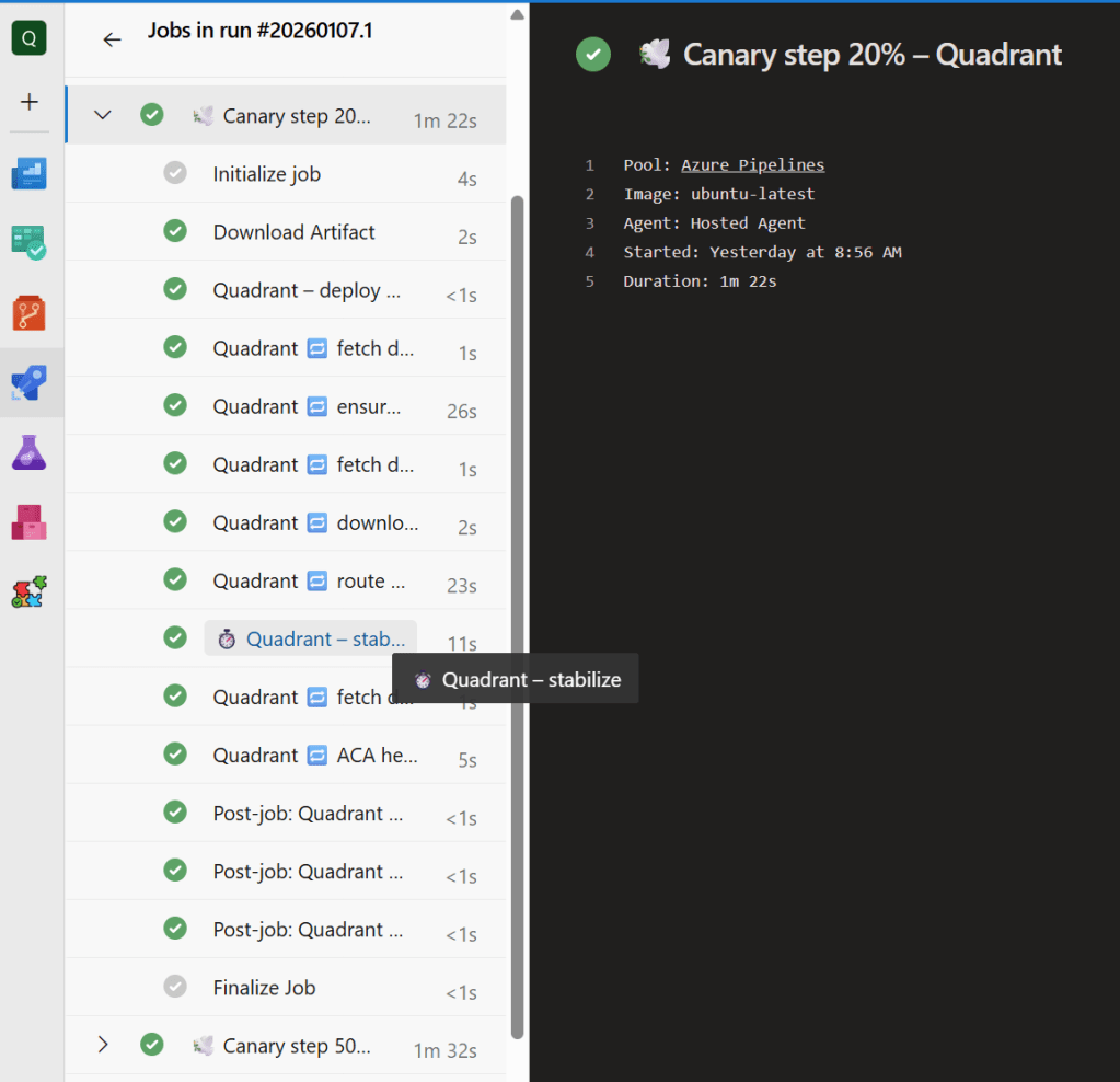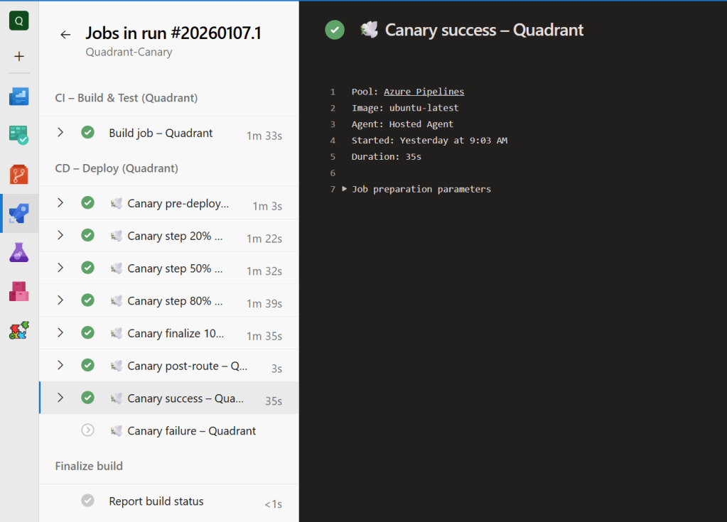 - Canary – supports both native Azure Pipelines canary mode and an orchestrated version that spins up sequential deployments (20%, 50%, 80%, 100%). Workload teams pass in their own